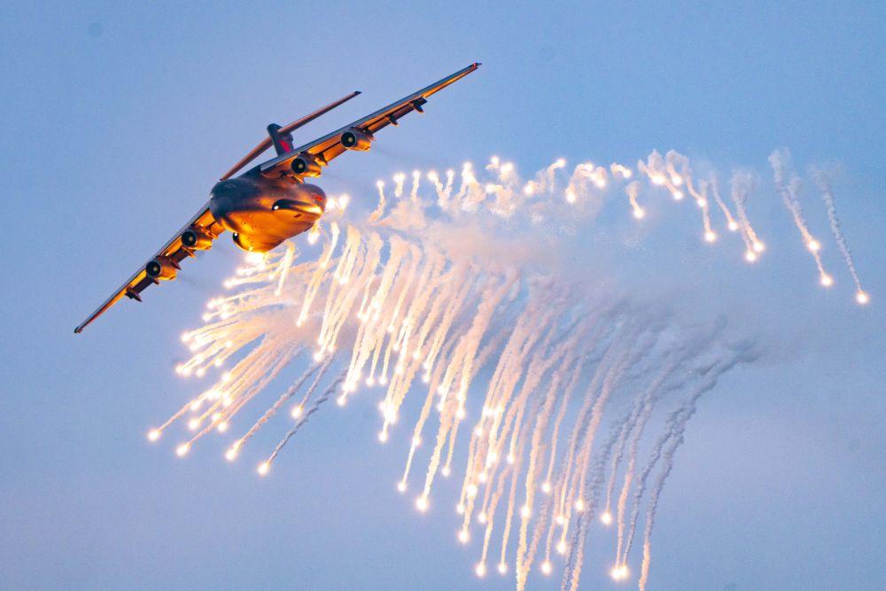 中部战区空军航空兵某团运-20飞机进行释放干扰弹训练(2020年12月10日摄)。新华社发(张猛 摄)