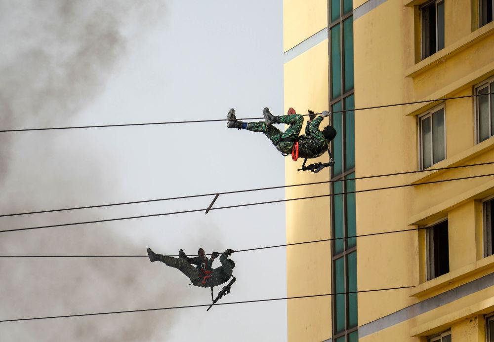 在模拟反恐演练中,武警猎鹰突击队特战队员利用铁索接近被“恐怖分子”占据的楼房(2019年4月4日摄)。新华社发(杨志毅 摄)