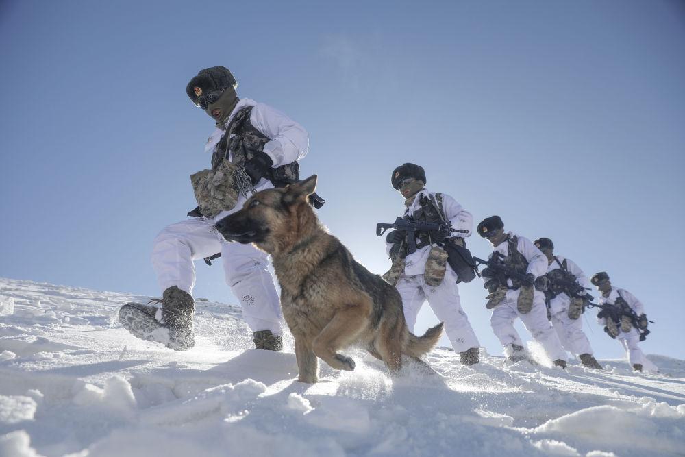 驻守帕米尔高原的新疆喀什军分区某边防团托克满苏边防连官兵按计划对海拔5100米的山口实施例行巡逻(2021年2月11日摄)。新华社发(姬文志 摄)