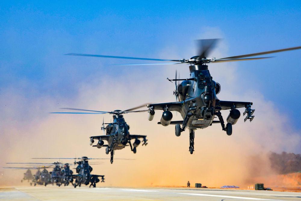 陆军第73集团军某陆航旅组织飞行训练,战机编队依次起飞(2021年4月22日摄)。新华社发(李士龙 摄)