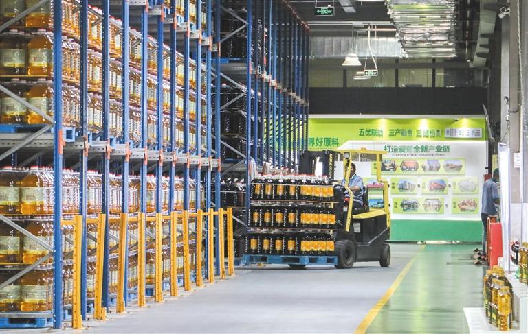 在西安爱菊粮油工业集团,工作人员装卸粮油。 记者 董剑南 摄