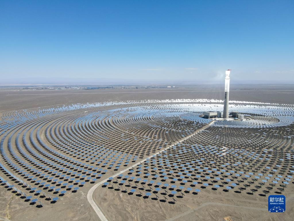 在新疆伊吾县淖毛湖镇拍摄的哈密50兆瓦熔盐塔式光热发电站(2021年8月22日摄,无人机照片)。作为新疆第一座光热发电站,哈密50兆瓦熔盐塔式光热发电站不仅污染物零排放,还通过储存热能实现24小时持续发电。新华社记者 高晗 摄