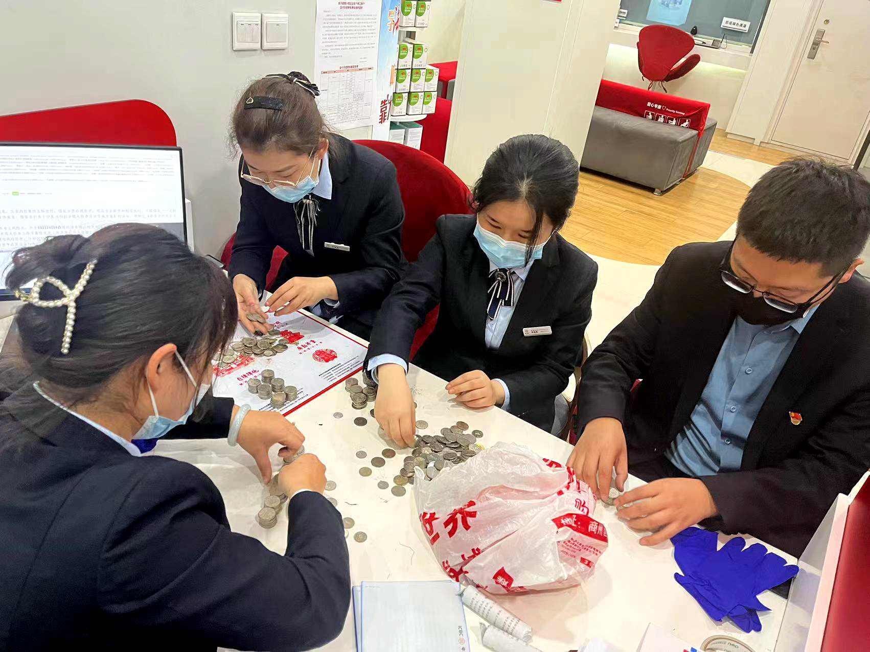 该客户刚一走进大厅,该行的网点大堂经理就热情的上前询问,了解到客户提的是一元和一角的硬币,数量达近千元。随后,客户面带愁容,试探性的询问是否可以帮助清点兑换。该行工作人员立即接过袋子,并结合当天的客流量和柜台人员的情况,将客户引导至非现金区。由于硬币量大,清点起来比较费时间,且不同币种的硬币混杂在一起,清点的难度较大。该行4名工作人员分工操作密切配合,挑拣、点数、码放、墩齐、包捆,不到1个小时就将零零散散的大小硬币码放整齐,成功为客户兑换一千二百余元,客户树起大拇指为该行周到的服务连连点赞道谢。