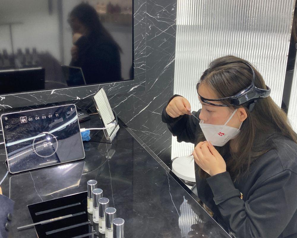 在一个叫“电波穿香室”的角落,体验者戴上一个形似黑色发箍的头部传感器,通过前额、侧面、后脑等多个点位的接触,检测在不同香味刺激下的脑电波。展方称据此可以找到更适合体验者的香水类型。