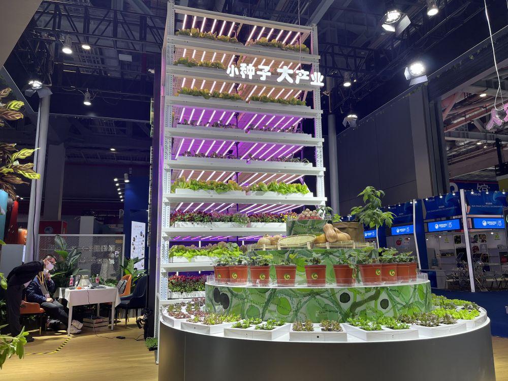 一层层生菜、白菜、三色堇在LED灯光照射下,颜色鲜亮、茁壮成长。这是本届进博会展出的“垂直农场”生产系统,呈现了未来农业的场景。
