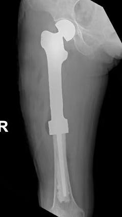 邢科主任在门诊仔细看了患者自带的X片后感觉这是一个恶性骨来源肿瘤,遂将患者收住院进一步检查。经过入院完善影像学检查,初步判断为骨内软骨肉瘤,一种骨组织来源的高度恶性肿瘤,临床诊断分期为右股骨近端软骨肉瘤(Enneking分期Ia G2T1M0)。骨软骨肉瘤对放疗化疗均不敏感,外科手术完整切除是目前常用的治疗手段。谨慎起见,先安排在局麻下取了少许病变组织活检,病理诊断与临床诊断一致,下一步就是手术治疗。