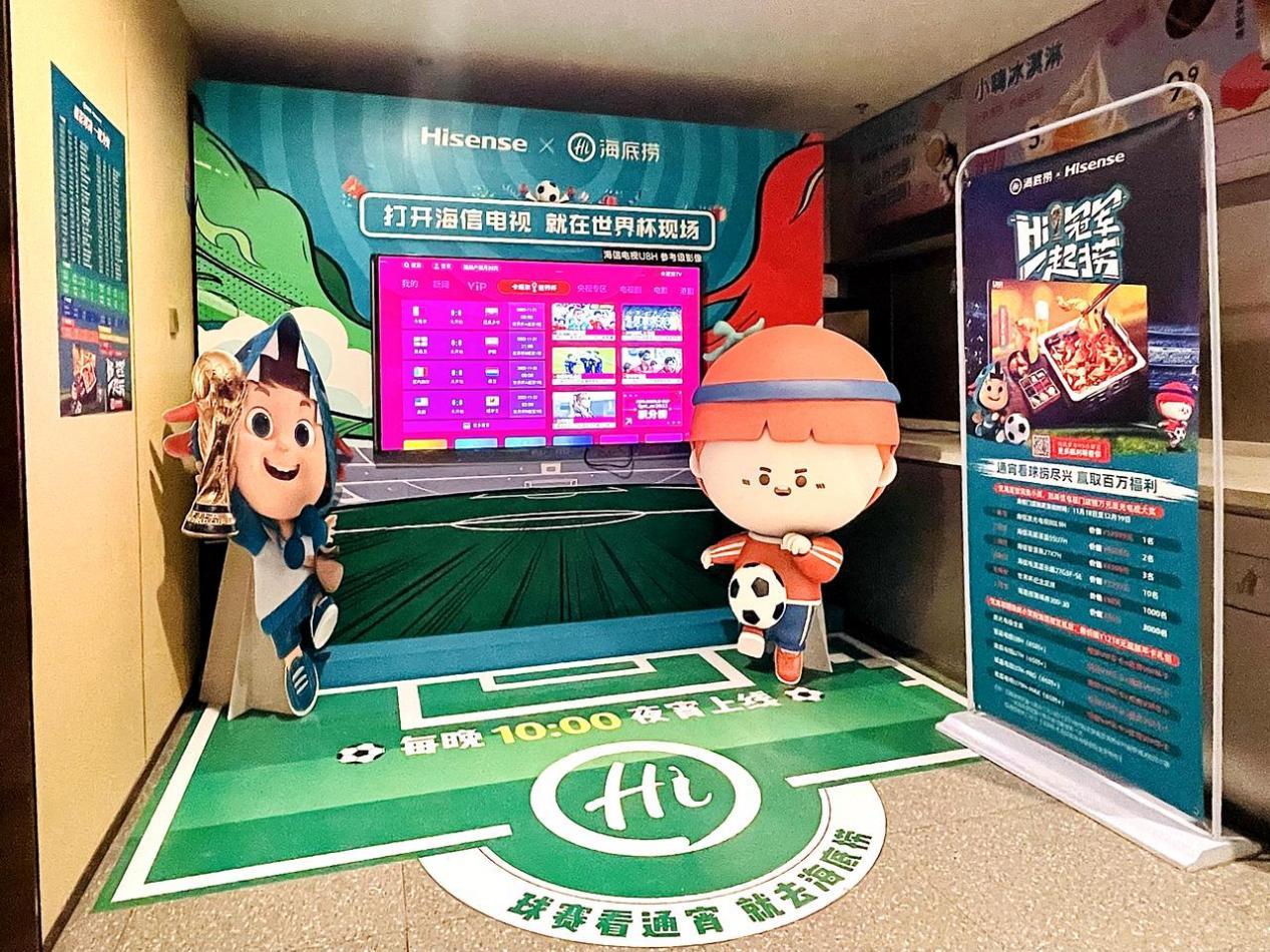 世界杯期间,海底捞与本届世界杯官方赞助商海信开展合作,在北京、上海、深圳联合海信电视打造三家主题门店,每家主题店设有“海底捞最佳观赛席”,配备移动观赛神器“27英寸海信健身智慧屏”,涮锅看球“零距离”。