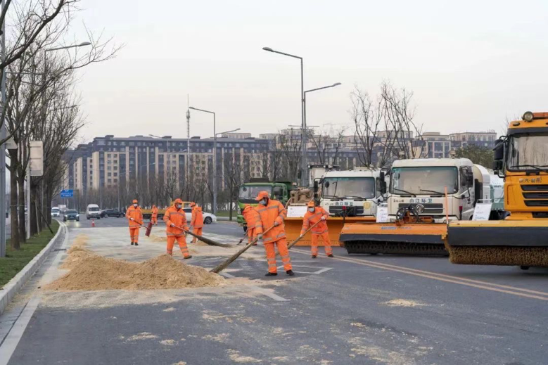 “隆隆隆——”快车道上同步进行着融雪剂撒布作业,25吨液体洒布除雪车、滚刷清雪车及铲雪车等开始了组合协作式作业。除雪车辆作业完成后,保洁员立刻跟上,路面遗留的少量“雪末”也被清理得干干净净。