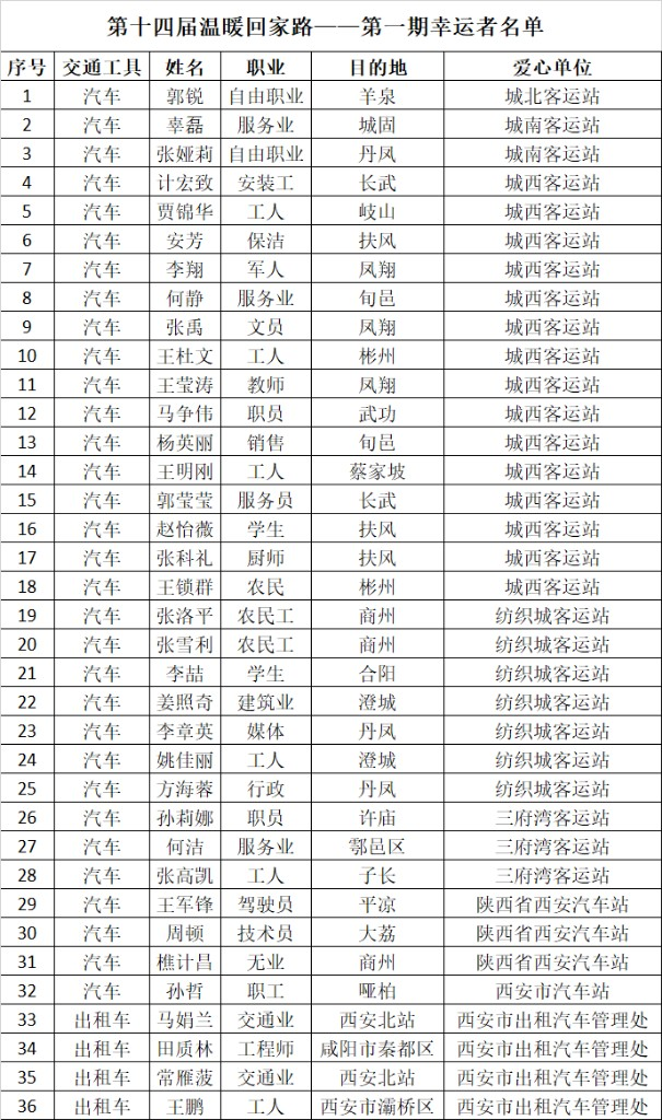 三秦都市报-三秦网讯(文/记者 陶颖 图/记者 代泽均)春节,总是让人无比激动,因为知道有个地方,牵挂了很久。2023年1月6日起,三秦都市报、三秦网、秦闻客户端、公益记者网、公益记者公众号联合西安七大客运站、西安市出租汽车管理处,启动第十四届温暖回家路之365张免费汽车票出租车票等您拿活动。8日,第一批幸运读者网友名单出炉。最美的风景,在回家路上。活动持续进行中,快来报名吧……