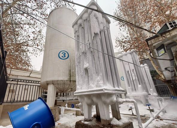 在平时,医院的病房终端管道完全可以满足日常供氧需求,但随着吸氧患者骤增,部分科室吸氧率已达到100%,原有的管道已无法满足终端供氧压力需求。氧气站原有的3台气化量为200 m³/h的液氧汽化器,每天同时工作汽化理想值为14400 m³,由于用氧量激增,室外温度低,3台汽化器24小时同时运转,气化器结冰、结霜严重,液态氧气化不完全,分气缸及管道表面也有结霜现象,实际汽化效率占理想值的84%,虽然通过人工扫霜、用鼓风机吹,提升汽化器周围空气流速、空调提升室内温度等措施来提升汽化效率,但现在医院每天用氧量高达9798 m³,接近极限。尤其是医院东片区干部病房、肿瘤大楼、东一楼、放疗楼等所在区域欠压报警频繁,通过提高供氧压力、打开二级减压箱旁通等措施,仍不能解决不断增加的用氧量。