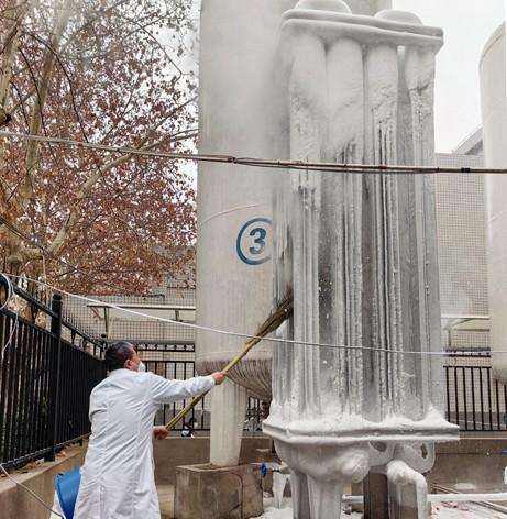 特事特办,急事急办!改善方案迅速得到院方批准,职能部门立即行动,紧密协同,争分夺秒,加班加点,力保改善工程早日完成。1月5日下午6点,第一台气化器到达医院,消毒供应科与施工单位第一时间动工,快马加鞭,晚上9点,仅用时3个小时即安装完成,顺利投入使用,原有的3台气化器结冰现象得到明显缓解,气化率从84%提高到90%。同时,紧急采购的200个氧气罐送至医院,总务部积极响应,安排专人24小时为医院各病区人工运送氧气罐,做到随叫随到,确保一线科室正常用气需求。1月7日上午,东片区供氧改善工程正式启动,基建办紧盯施工现场,抓质量一丝不苟,抢进度分秒必争。保卫部全程追踪,加强施工现场保卫管理,确保各项施工安全合规。与此同时,医务部合理优化患者布局,制定发布《普通病房新冠感染患者氧疗推荐方案》,指导临床为患者提供个体化诊疗方案,确保宝贵的医用氧得到最充分最合理的使用。