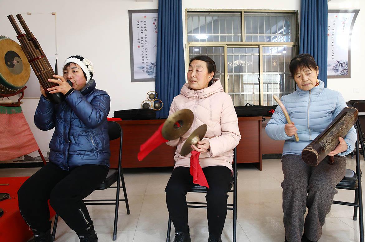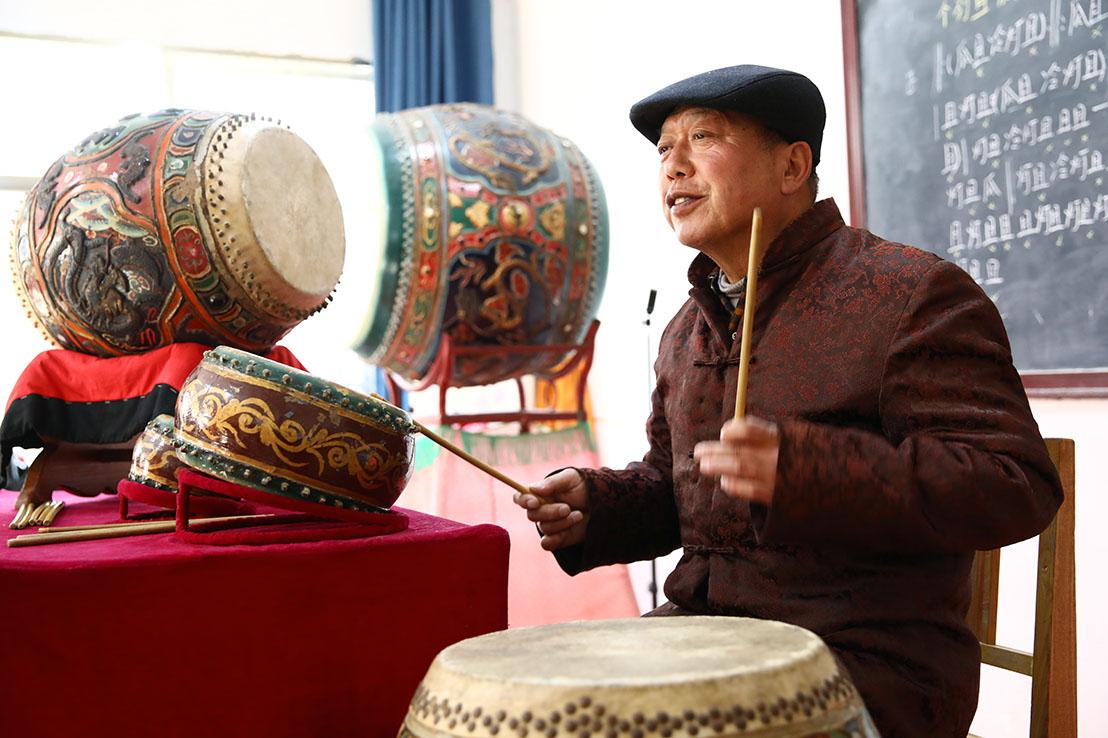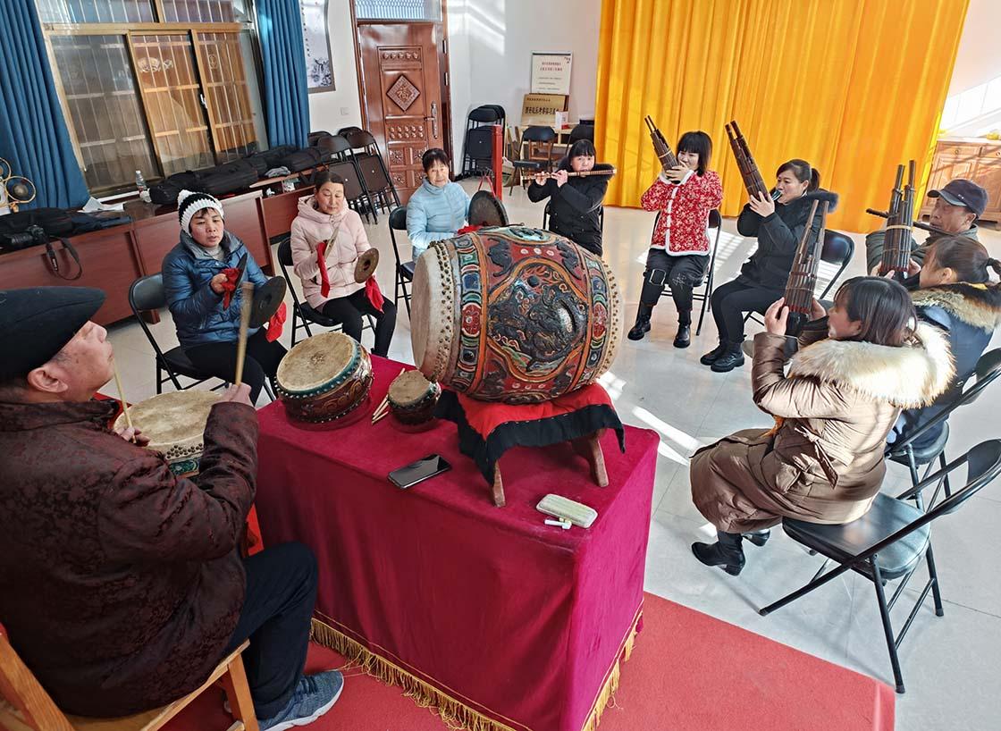 1月7日,吃过午饭,在一座传统关中院落中,10名乐手围圈而坐,有的吹奏笛、笙、管,有的敲击大钹、小钹、云锣,但乐器再多,主角都是鼓。田孝梨指着自己面前的四面鼓一一介绍:“这是座鼓,轻易不敲;这是豆鼓,起乐时敲击的是乐鼓,还有战鼓……”不同乐器在鼓点声中互相交替,演奏着东方古老的交响乐。