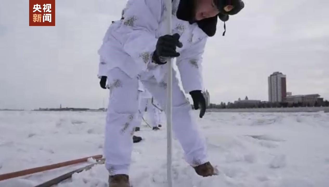 冻结的江面下层时常会有没完全冻结的清沟,表面被大雪覆盖不易被发现,为了排除日常执勤的安全隐患,指导员王振华带领着测冰队伍开始逐点检测。