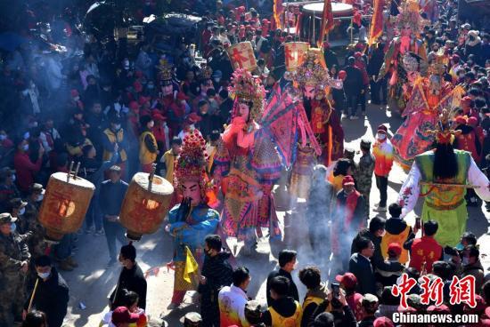 1月31日,福建省福州市长乐区潭头镇厚福村举行传统民俗文化活动。厚福村是福建著名侨乡,该村民俗文化活动于每年正月初十及正月二十六举行,至今已有400多年的历史。活动举行期间,全体村民踊跃参与,祈福国泰民安、风调雨顺。图为民俗文化活动中的巡游队伍。