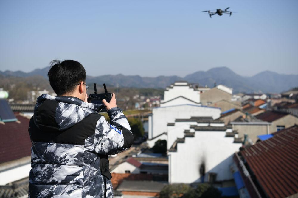 1月31日,郭昊在安徽省六安市舒城县汤池镇进行无人机航拍。