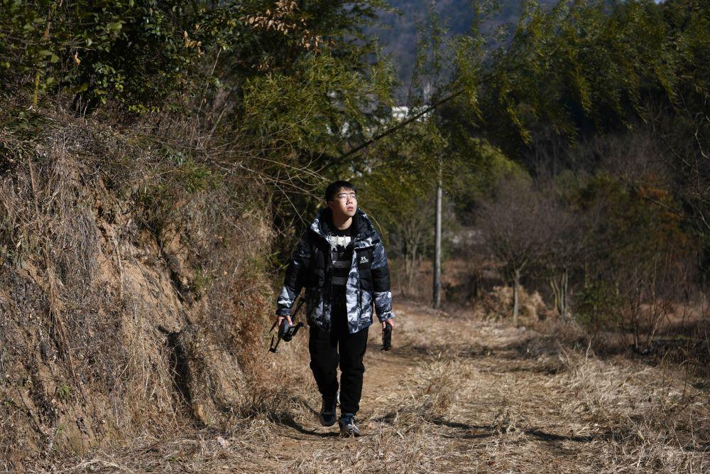 1月30日,郭昊走在安徽省六安市舒城县汤池镇的山路上准备进行无人机航拍。