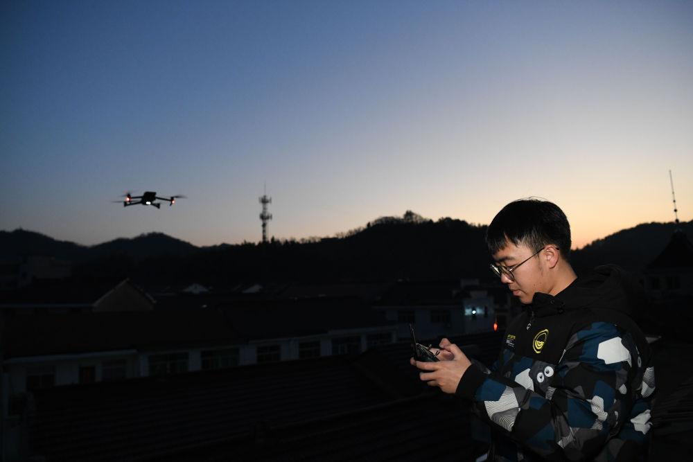 1月31日,郭昊在安徽省六安市舒城县汤池镇准备进行无人机航拍。