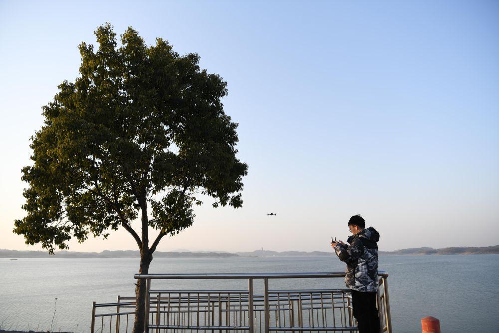 1月30日,郭昊在安徽省六安市舒城县汤池镇三江码头进行无人机航拍。