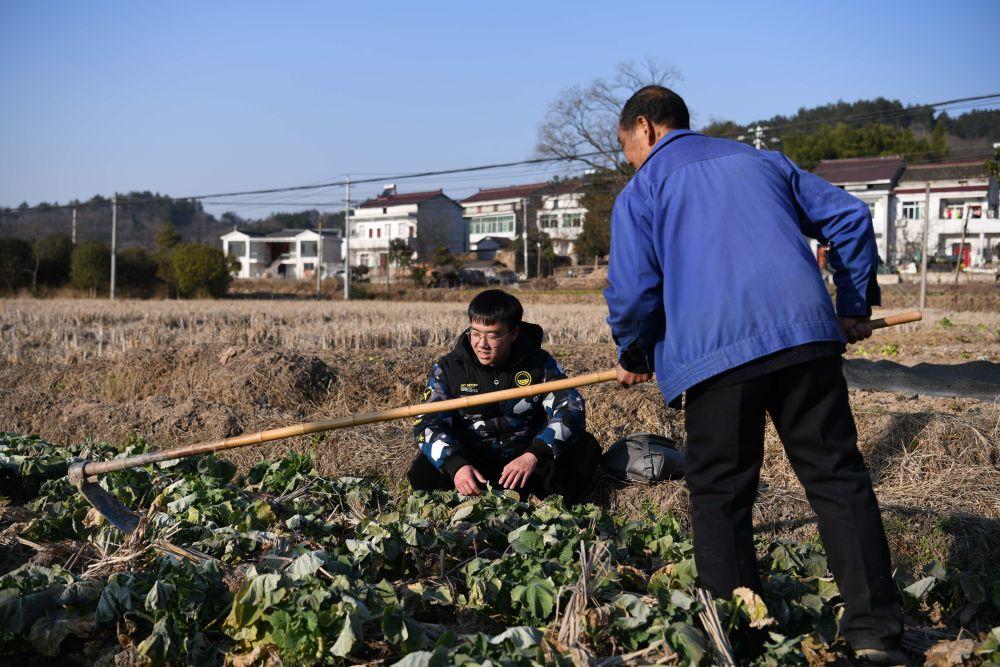 1月31日,郭昊(右)在安徽省六安市舒城县汤池镇与当地村民交流。