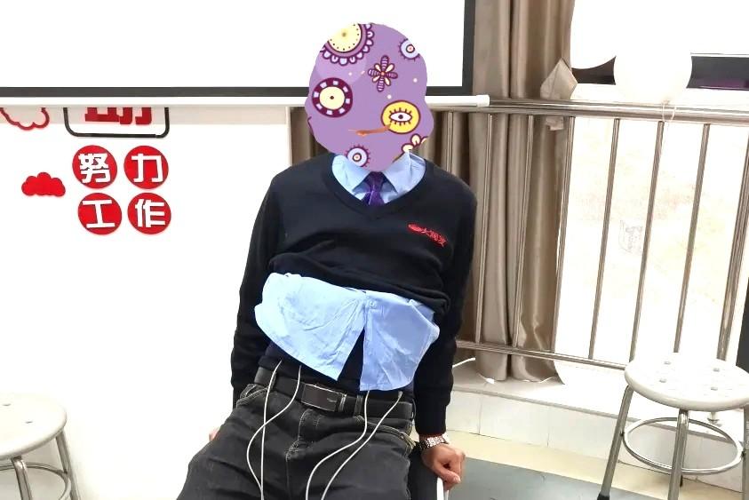 讲座结束后,分娩阵痛体验活动正式开始,工作人员将分娩阵痛体验仪的电极片贴在准爸爸腹部一圈,通过调节分娩仪的电流强度使其传输到准爸爸的腹部,模拟孕妈妈分娩开指时的阵痛感。