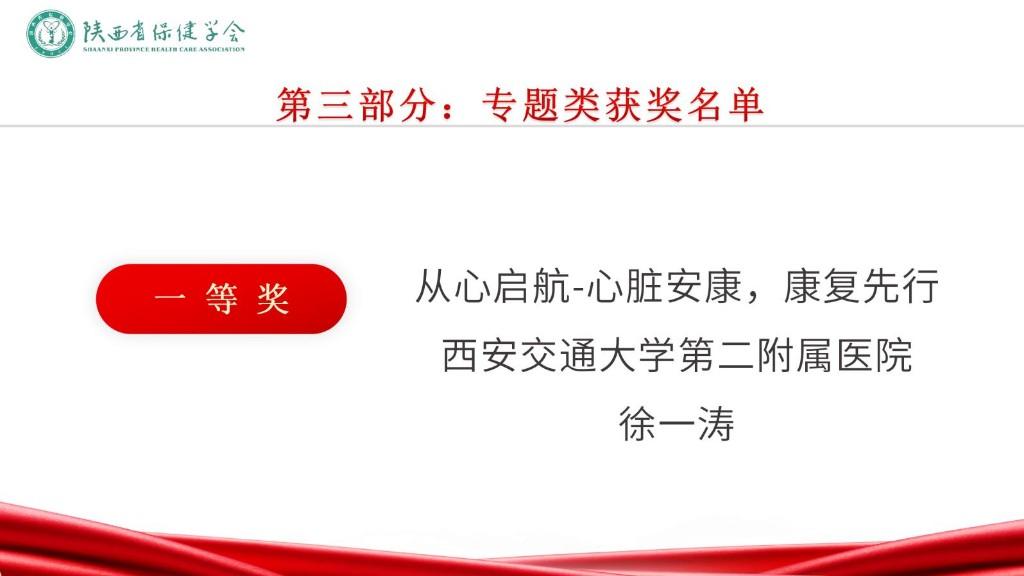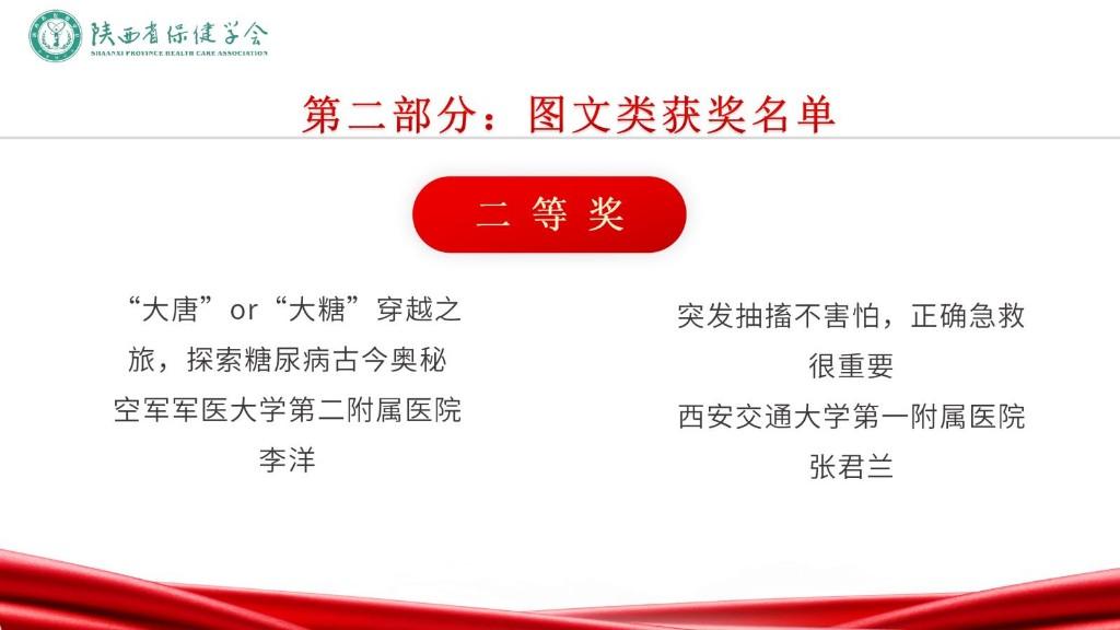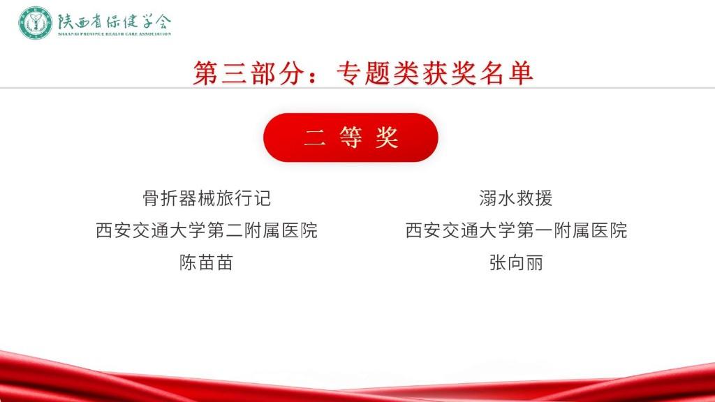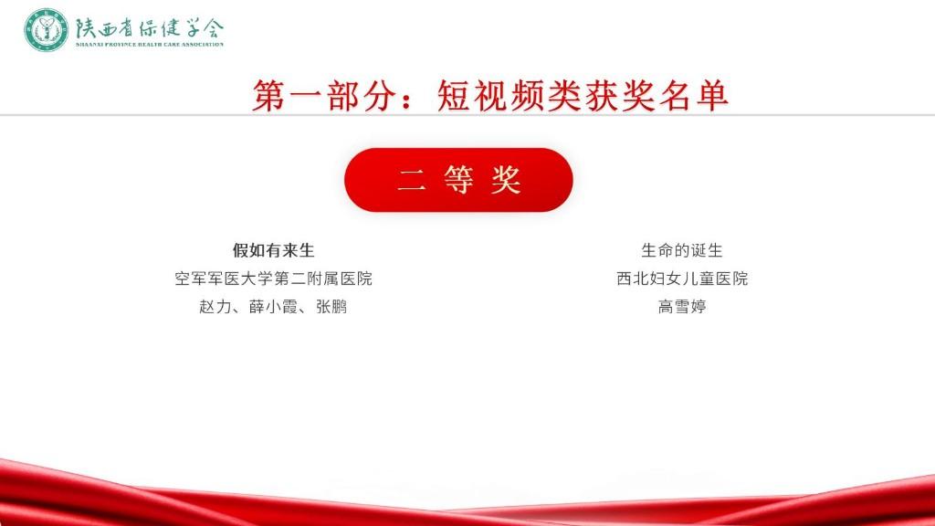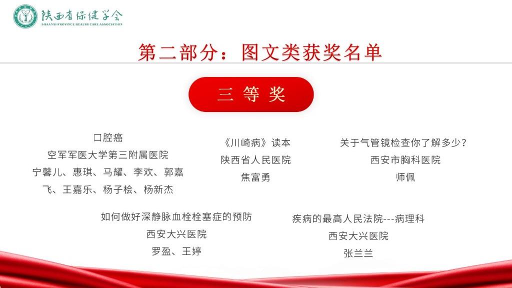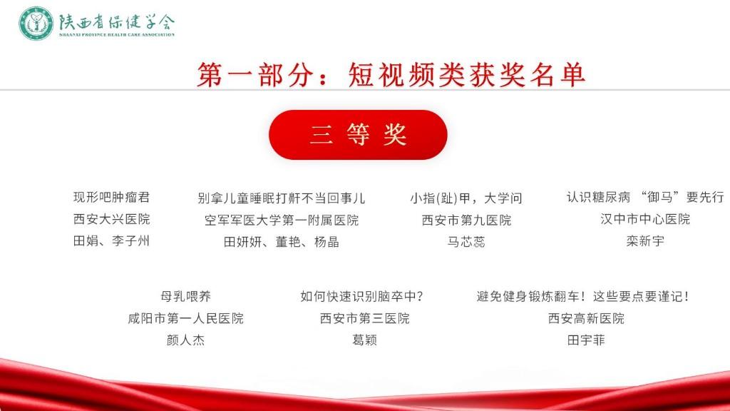 评审现场,由各医学学健康科普领域和媒体专家组成评审团,从科学性、艺术性、传播性、影响力等方面对入围短视频类前10名、专题类前6名、图文类前8名作品进行评审打分,并从健康科普宣讲、作品创作、荣誉奖励等方面对入围对象进行综合评定。依据各单位参赛作品数量,结合网络投票情况,西安交通大学第一附属医院、渭南市第二医院、空军军医大学第二附属医院、西安市大兴医院、西安交通大学第二附属医院、西安国际医学中心医院、商洛市中心医院、西安市人民医院、陕西省人民医院、西安市第三医院、陕西省保健学会社区护理专业委员会、西安高新医院、西安市第九医院、陕西省保健学会品牌建设与健康传播专业委员会获本届优秀组织奖。