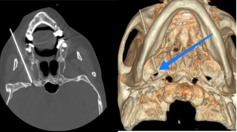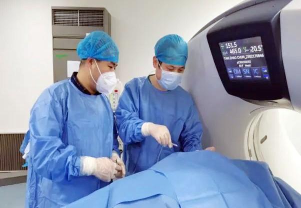 手术在局麻下进行,首先由孙文国主任及其影像介入团队,对卵圆孔进行CT定位、计划穿刺角度,制定分次进针的穿刺计划,由卢斌主任穿刺至卵圆孔,经CT三维重建后可以清楚的显示出穿刺针精准的到达目标位置,三维重建后针尖位置准确,然后进行了感觉与运动神经测试,最后通过针尖端向神经纤维传达射频电流,选择性的射频调控三叉神经病损支神经根到达止痛的目的,手术创口小,痛苦少,仅一个小时就顺利完成。