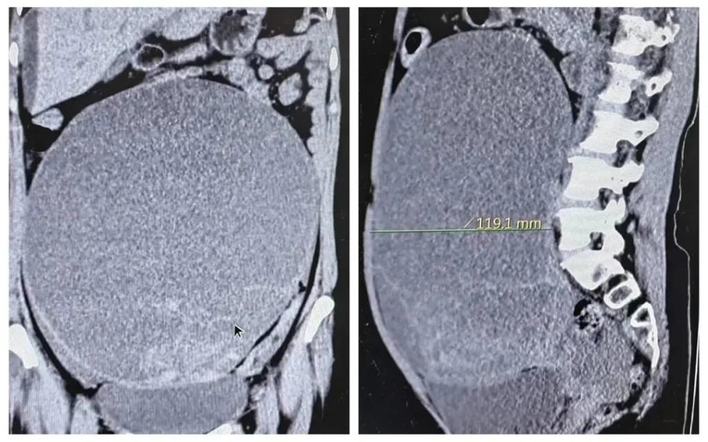 刘女士今年50岁,去年身体开始发胖,但是除了肚子大了一圈并没有其它不适,她以为只是长胖了,并未将此事放在心上。但是短短一个月,她的肚子不断变大,体重在快速增加,可面部及四肢却越发消瘦,刘女士以为是肠胃出了问题,便来长安区医院消化内科就诊。但是检查结果却让所有人大吃一惊,上腹部彩超显示刘女士肚子里的肿瘤已经把整个盆腔和腹腔的脏器全部挤压到了一旁,肿瘤体积巨大,直径更是达到了26厘米。严重压迫了消化道和呼吸道,需要立即入院手术。