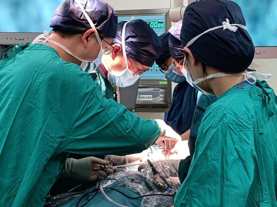 麻醉科朱敦教授等以高超的技术保障了术中多多生命体征的平稳。同时,术中还邀请胸外科张云峰主任医师、高山医师等协助。在手术室、麻醉科、胸外科的通力配合下,曹振杰主任团队在单孔胸腔镜下轻柔地松解病肺周围的粘连,抽丝剥茧,暴露病灶,仔细游离其滋养血管及肺段,当病变肺叶被完整离断取出后大家松了一口气。