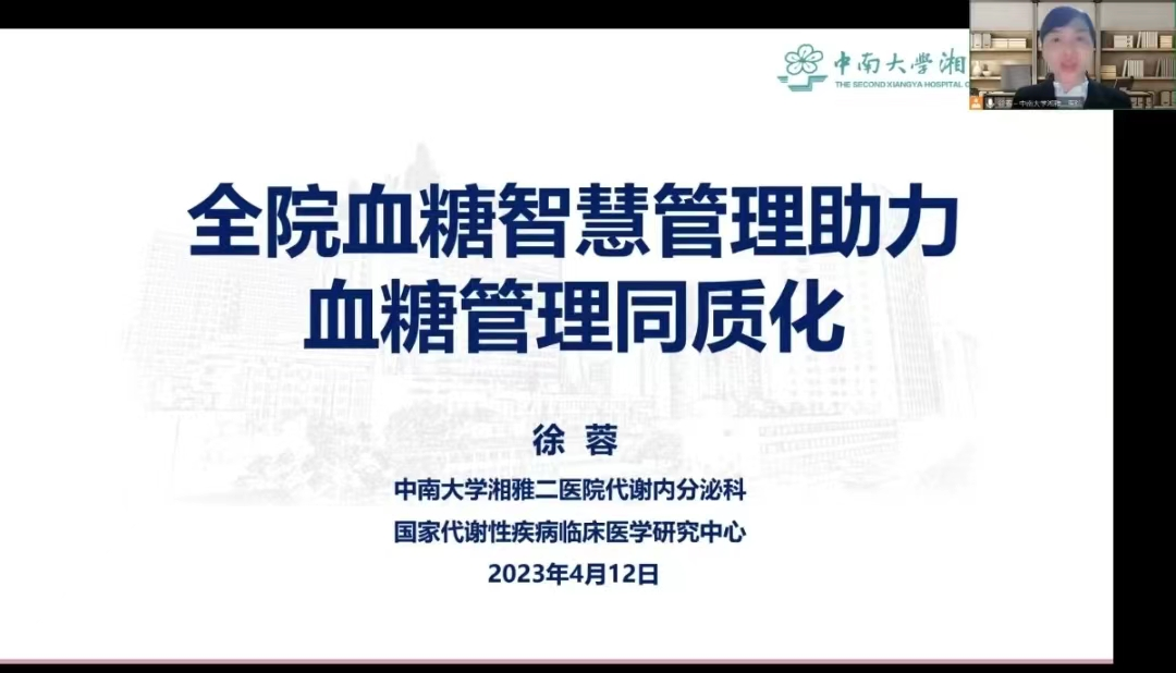 中南大学湘雅二医院代谢内分泌科徐蓉护士长,线上为学员们讲解了《全院血糖智慧管理助力血糖管理同质化》,全院血糖同质化管理属于新型护理措施,充分体现了现代护理理念,可以充分发挥护士的主观效能,提高专科护理质量,她生动的讲解,让学员们听得津津有味。