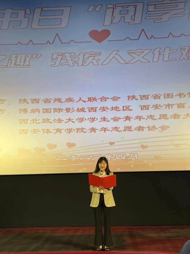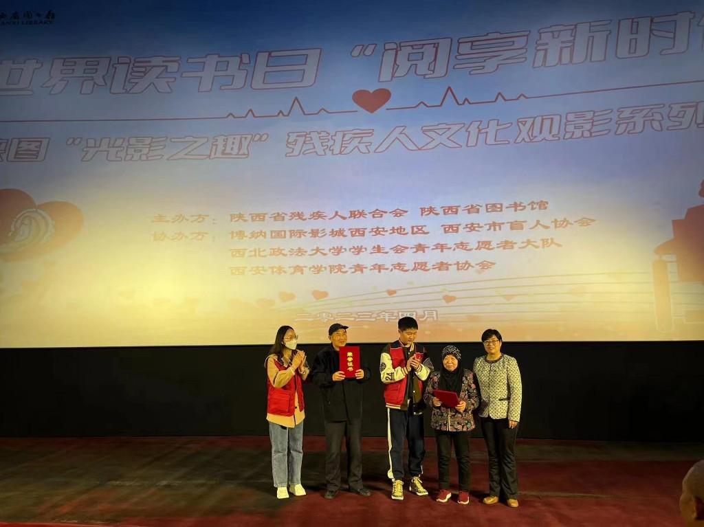 三秦都市报-三秦网讯(记者 夏明勤)4月22日,由陕西省图书馆、陕西省残疾人联合会共同主办,西安博纳国际影城、西安市盲人协会、西北政法大学学生会青年志愿者大队、西安体育学院青年志愿者协会协办的陕西省图书馆“光影之趣”残疾人文化观影系列项目——世界读书日“阅享新时代”残疾人无障碍文化观影活动在西安博纳国际影城大悦城店顺利举办。陕西省图书馆副馆长强颖致辞。现场,视障、肢残等残疾群体和志愿者100余人参加活动。