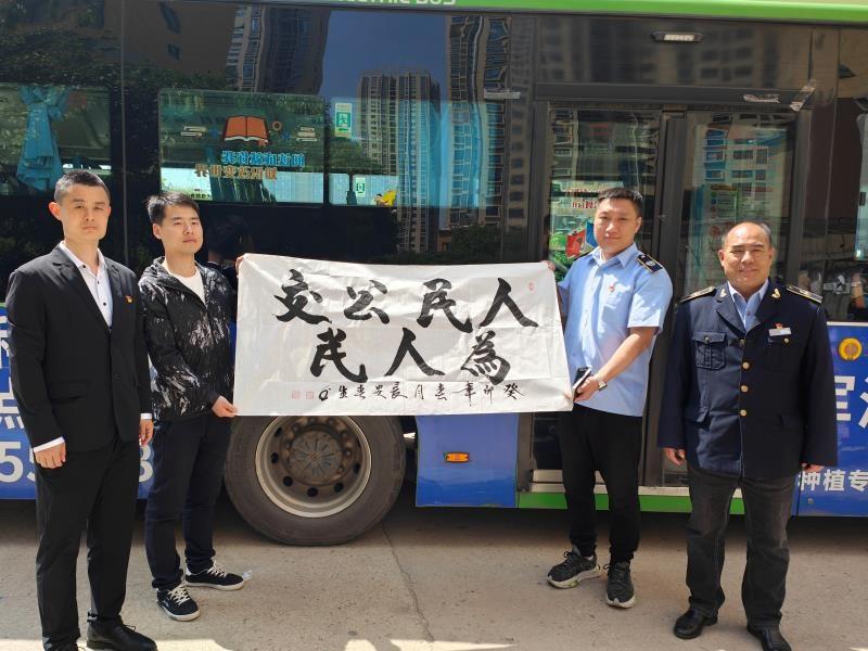 活动最后,居民登上流动“书厢”借阅书籍,畅游书海、浸润书香,热爱书法的居民在“书厢”内挥毫泼墨,送上“人民公交为人民”的书法作品,感谢公交为市民出行作出的巨大贡献。