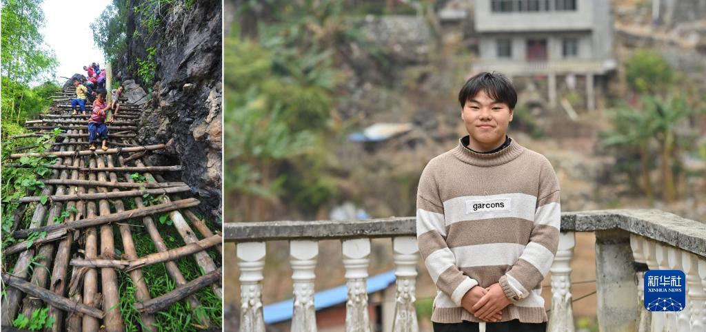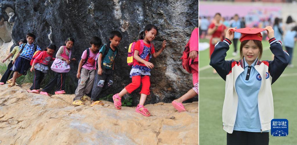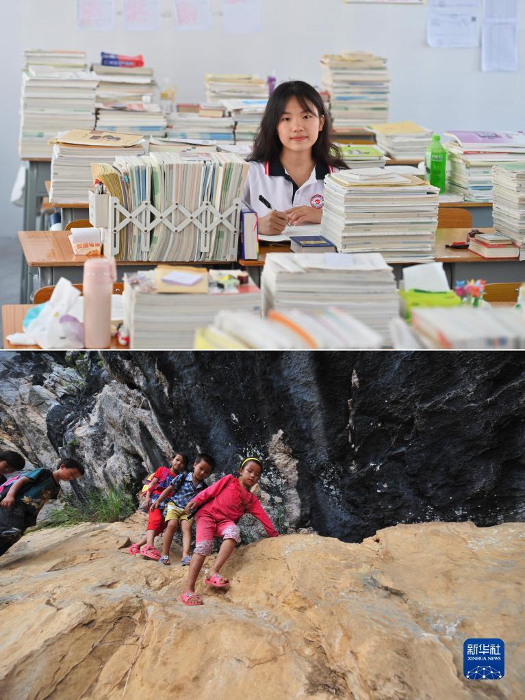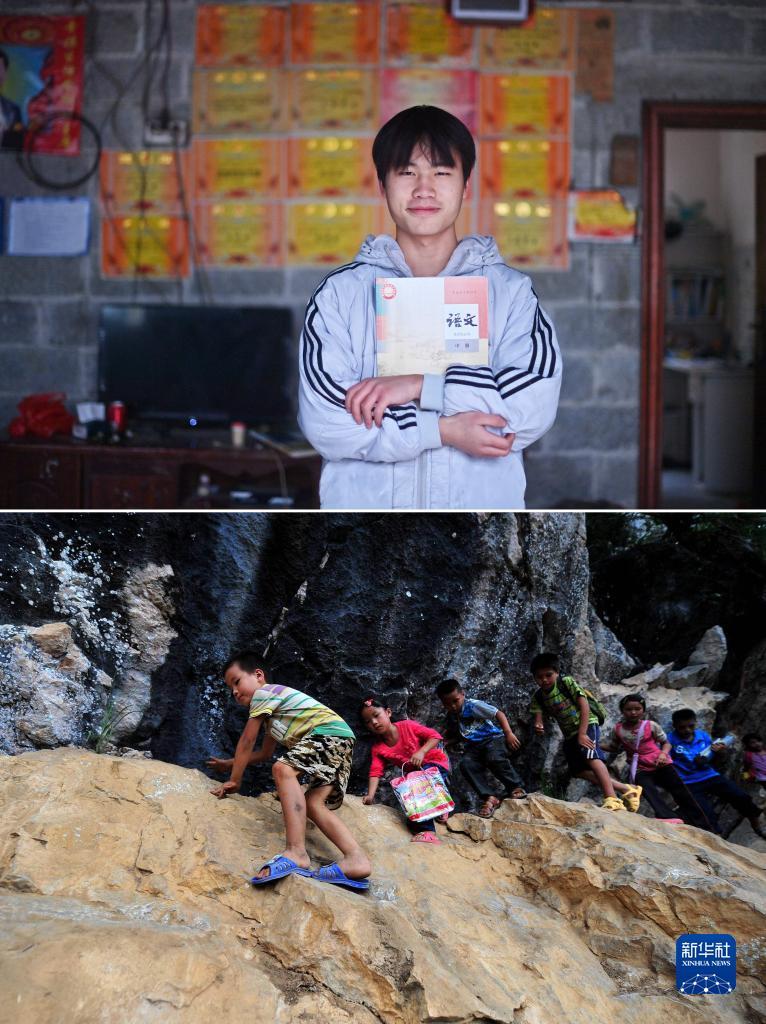 拼版照片:上图为2023年5月20日,蒙俐谷在大化瑶族自治县第二中学高二年级教室里学习(新华社记者胡星宇摄);下图为2012年9月3日,在大化瑶族自治县板升乡弄雷村,7岁的蒙俐谷(右一)爬悬崖去学校读书(新华社记者黄孝邦摄)。一年后将参加高考的蒙俐谷,希望能考上理想的大学。