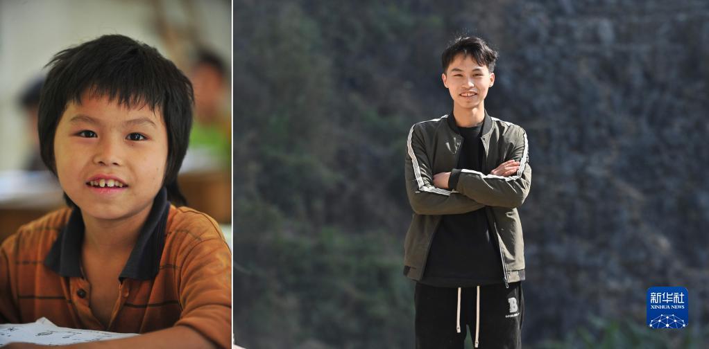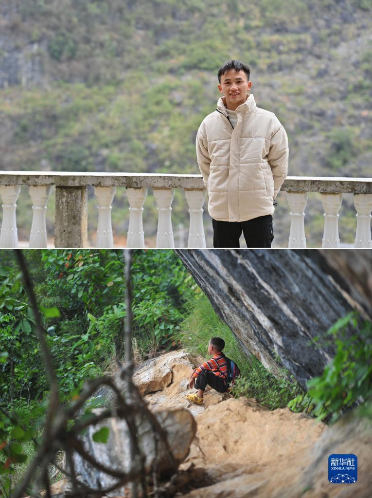 拼版照片:上图为2023年1月16日,在大化瑶族自治县板升乡弄雷村,即将从技校毕业的蒙科佑站在家门口;下图为2012年9月5日,在大化瑶族自治县板升乡弄雷村,10岁的蒙科佑在上学途中,坐在悬崖边上休息。21岁的蒙科佑,希望能挣钱供弟弟妹妹读书,让他们接受更好的教育。
