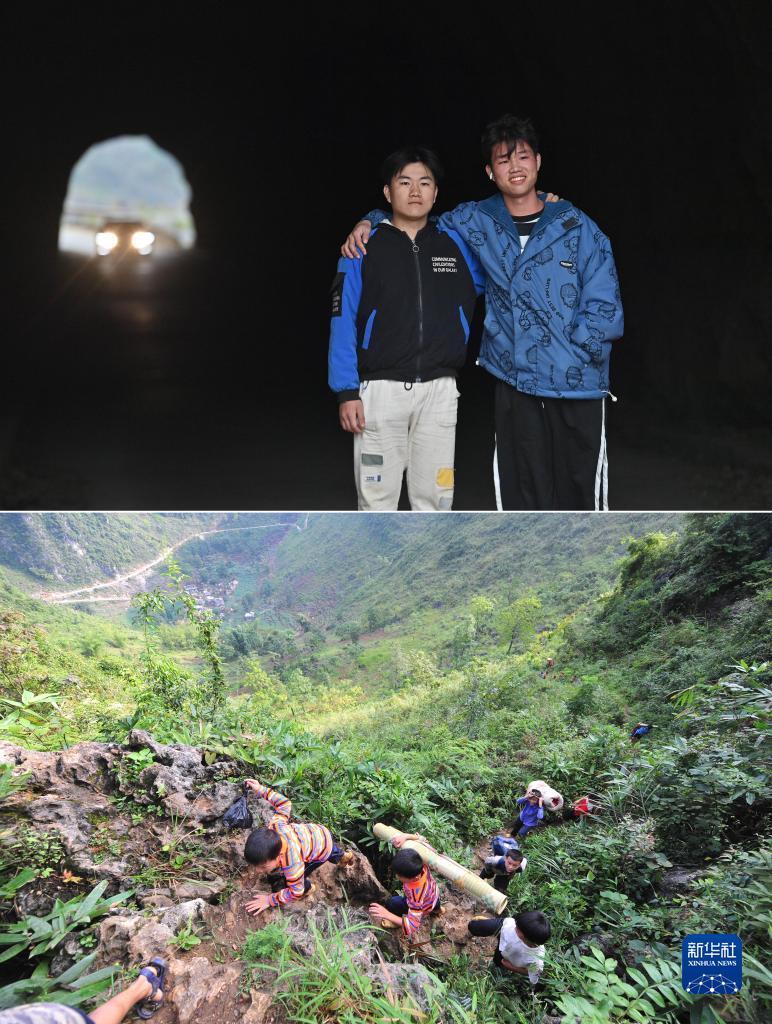 拼版照片:上图为2023年1月20日,在大化瑶族自治县板升乡弄勇村,22岁的蒙宣任(左)和弟弟蒙宣汰站在通往弄勇小学的隧道旁合影,隧道上方是他们儿时上学需要攀爬的“天梯”;下图为2012年9月3日,在大化瑶族自治县板升乡弄勇村,蒙宣汰(左一)、蒙宣任(左二)爬山路去学校。蒙宣任目前在辽宁省交通高等专科学校读书,弟弟蒙宣汰从技校毕业后在广东一家汽修厂上班。
