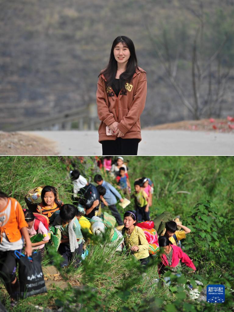 拼版照片:上图为2023年1月21日,在大化瑶族自治县板升乡弄勇村,大专毕业后在广州工作的蓝秋艳回家过年时在家门口留影;下图为2012年7月4日,学校放假后,11岁的蓝秋艳(着黄衣者)背着生活用具,走在回家的山路上。22岁的蓝秋艳正在努力考取教师资格证。