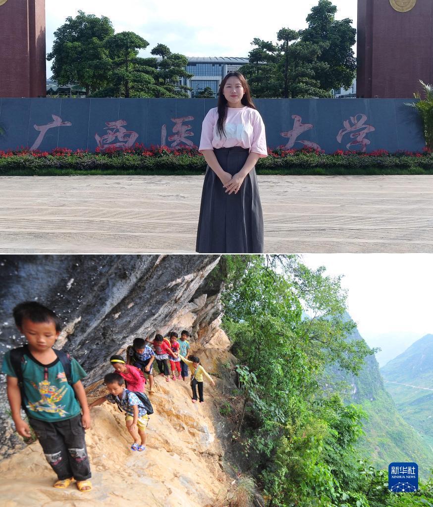 拼版照片:上图为2023年5月27日,22岁的蒙秋艳站在她就读的广西医科大学校门口(新华社发);下图为2012年9月3日,在大化瑶族自治县板升乡弄雷村哈保屯,11岁的蒙秋艳(右一)在悬崖边护着低年级的小伙伴回家(新华社记者黄孝邦摄)。2021年,蒙秋艳以优异的成绩,考取广西医科大学。