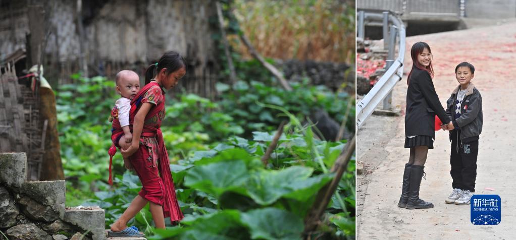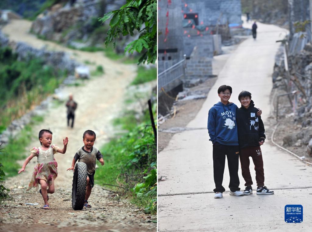 拼版照片:左图为2012年7月16日,在大化瑶族自治县板升乡弄勇村,4岁的蒙宣宏(左)穿着姐姐的旧衣服和同为4岁的蓝小帅在一起玩耍;右图为2023年1月21日,在大化瑶族自治县板升乡弄勇村,蒙宣宏(左)和蓝小帅合影。蒙宣宏和蓝小帅目前分别在板升乡和大化县城读初二。