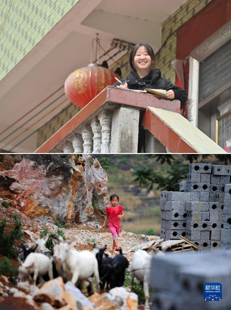拼版照片:上图为2023年1月16日,在大化瑶族自治县板升乡弄勇村,正在读初中的蓝秀雪在家门口学习;下图为2013年7月14日,5岁的蓝秀雪在放羊。16岁的蓝秀雪即将参加中考,希望能考上一所好高中。