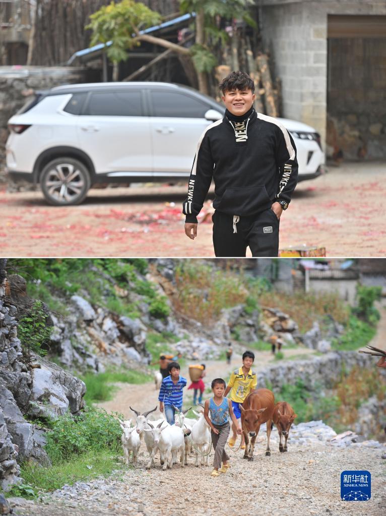 拼版照片:上图为2023年1月21日,在大化瑶族自治县板升乡弄勇村,22岁的蒙宣朝站在自己刚刚购买的汽车前;下图为2012年7月16日,在大化瑶族自治县板升乡弄勇村,11岁的蒙宣朝(前)利用暑假帮家里放牧。技校毕业后,蒙宣朝到广东工作。