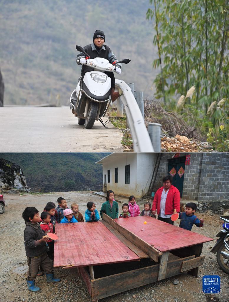 拼版照片:上图为2023年1月26日,在大化瑶族自治县板升乡弄勇村,在广东工作、返乡过年的蒙宣海在路边休息;下图为2012年12月27日,在弄勇村弄顶教学点,7岁的蒙宣海(右一)在打乒乓球。2022年,蒙宣海技校毕业后,选择去广东工作。