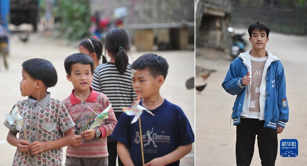 拼版照片:左图为2012年7月4日,在大化瑶族自治县板升乡弄勇小学,7岁的蒙旺兵(左二)在校园里玩风车;右图为2023年1月25日,在大化瑶族自治县板升乡弄勇村,正在桂林理工大学读大一的蒙旺兵寒假回家时在村中留影。
