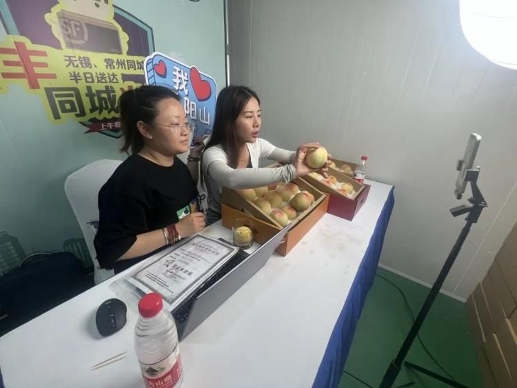 在阳山水蜜桃临时交易市场内,一支支果农团队和在校学生组成的直播团队已经开启了带货模式。线上刚刚成交的水蜜桃,由顺丰速递当场秒发秒寄。通过“线上+线下”相结合的销售方式,有效助力阳山桃农增收、桃产业增效。