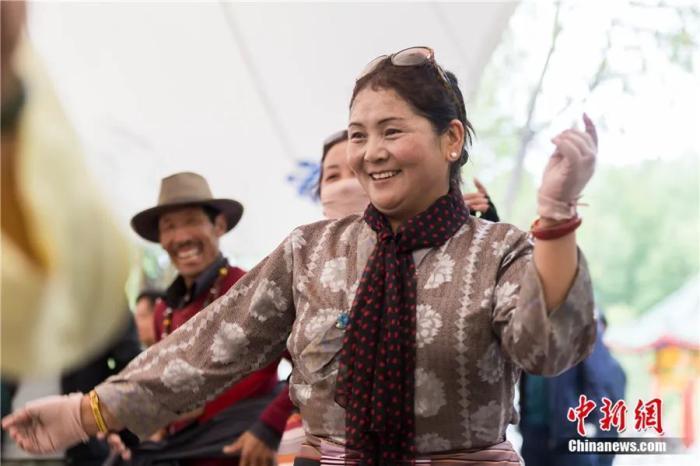 拉萨民众在布达拉宫宗角禄康公园跳锅庄舞。雪域高原“全民健身”模式已开启。何蓬磊 摄