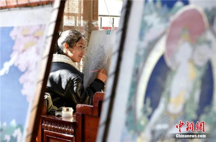 索朗次旺在西藏拉萨绘制唐卡。随着社会的发展,越来越多的西藏女性学习唐卡绘画。李林 摄