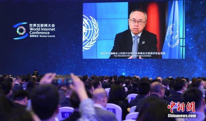 2023年11月8日,2023年世界互联网大会乌镇峰会在浙江乌镇开幕,主题为“建设包容、普惠、有韧性的数字世界——携手构建网络空间命运共同体”。图为联合国副秘书长李军华视频演讲。