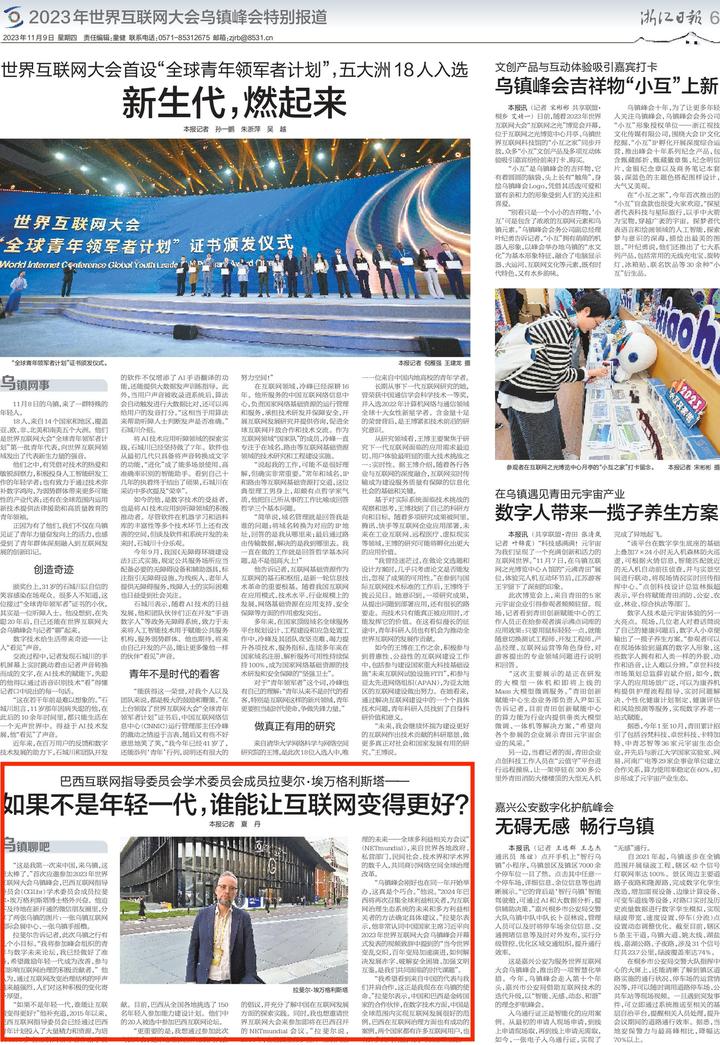 11月9日,《浙江日报》刊发《巴西互联网指导委员会学术委员会成员拉斐尔·埃万格利斯塔——如果不是年轻一代,谁能让互联网变得更好?》,全文如下: