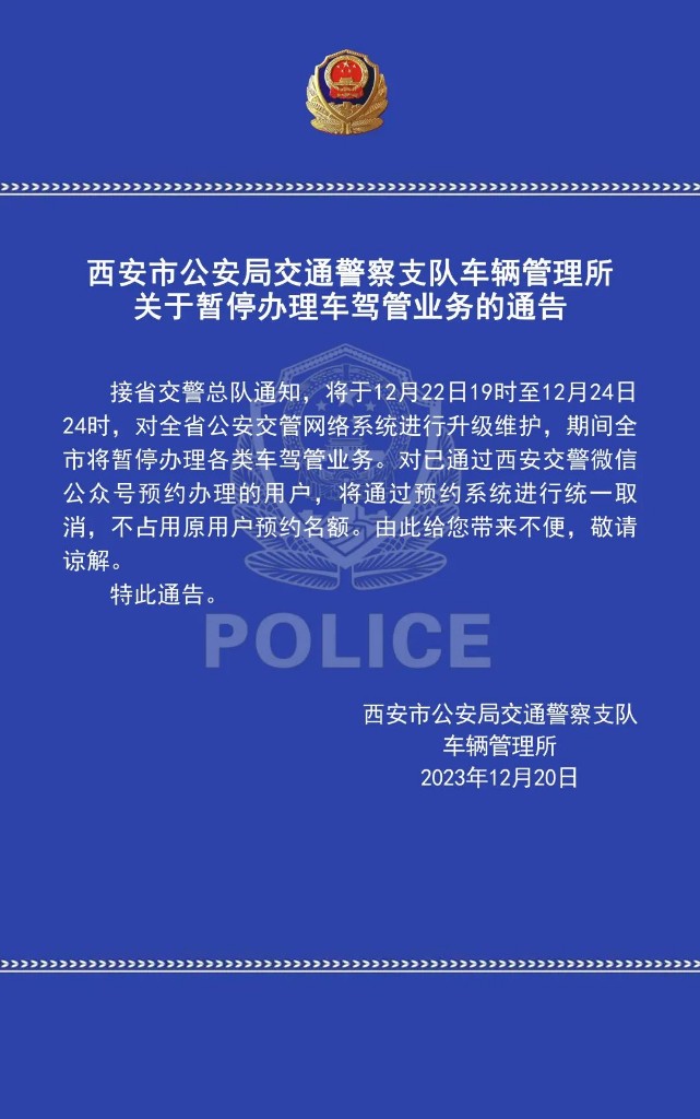 三秦都市报-三秦网讯(记者 李佳)西安交警发布通告,接省交警总队通知,将于12月22日19时至12月24日24时,对全省公安交管网络系统进行升级维护,期间全市将暂停办理各类车驾管业务。对已通过西安交警微信公众号预约办理的用户,将通过预约系统进行统一取消,不占用原用户预约名额。由此给您带来不便,敬请谅解。