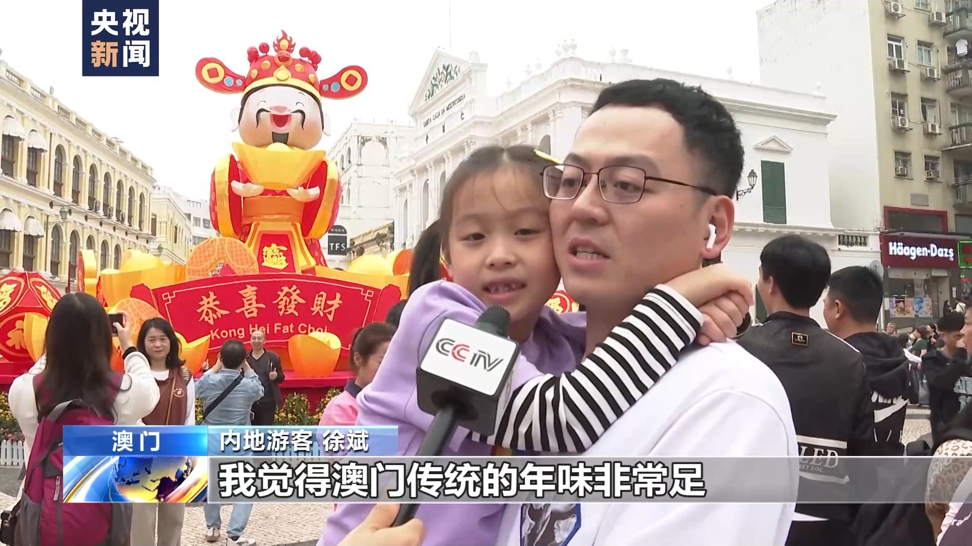 内地游客 徐斌:这是我第一次来澳门。我觉得澳门传统的年味非常足,大街小巷都张灯结彩,洋溢着过年的气氛。