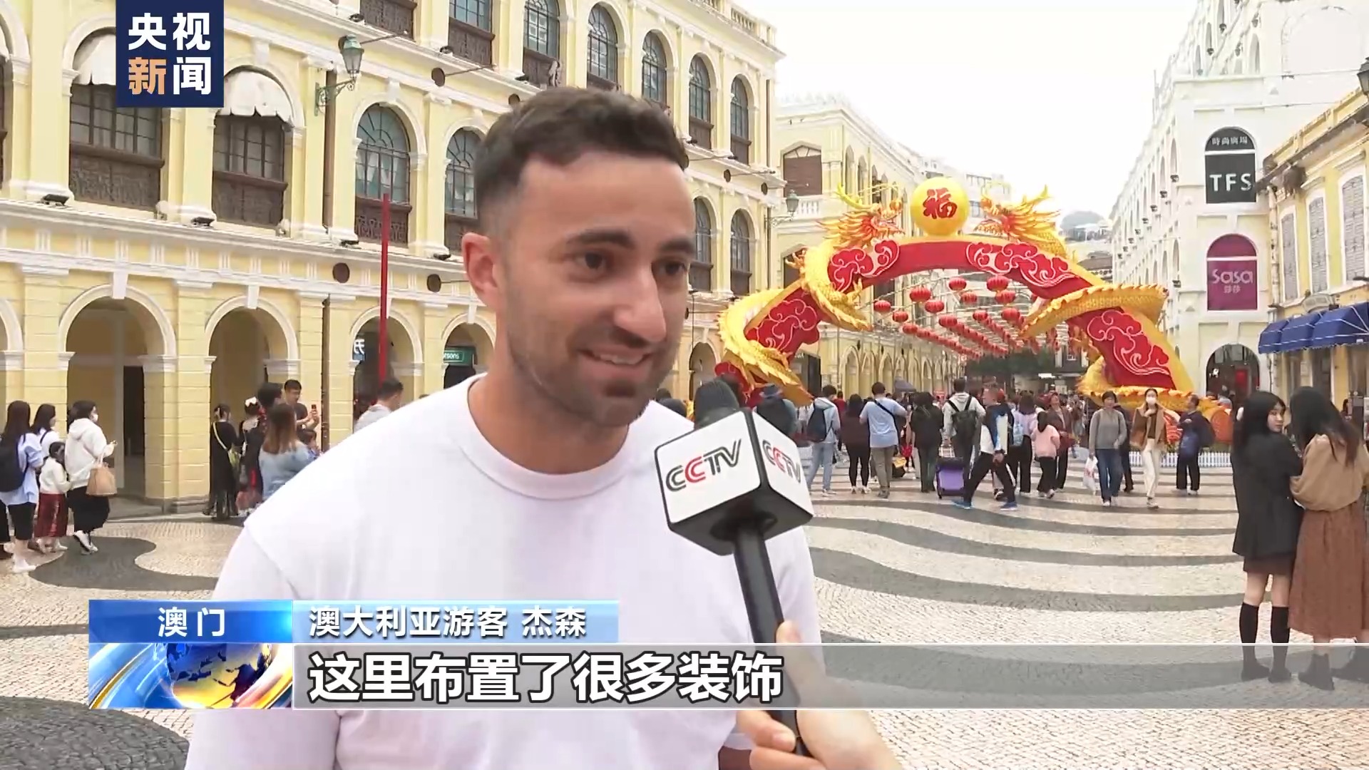 澳大利亚游客 杰森:春节对中国人来说非常重要,这里的节日氛围非常浓,这里布置了很多装饰。很高兴能来到这里,和家人朋友,以及所有来澳门游玩的中国人一起庆祝春节。