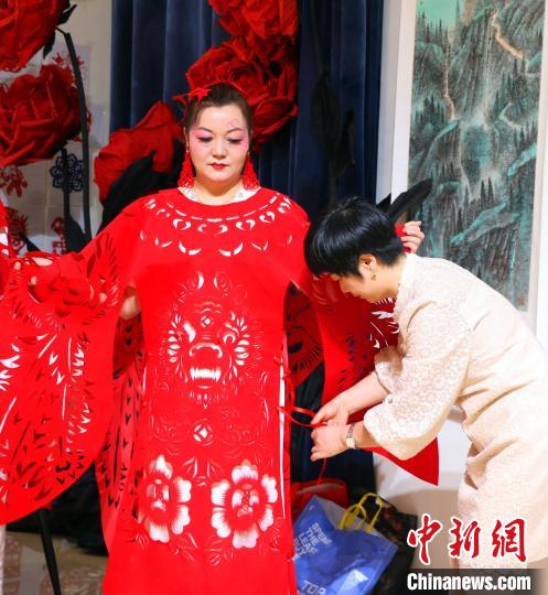 9名身着龙凤呈祥、年年有余(鱼)、富贵牡丹等主题红色剪纸服饰的女子,在悠扬的乐曲中款款走秀,让国家级“非遗”——中国剪纸流动起来。韩欢欢 摄